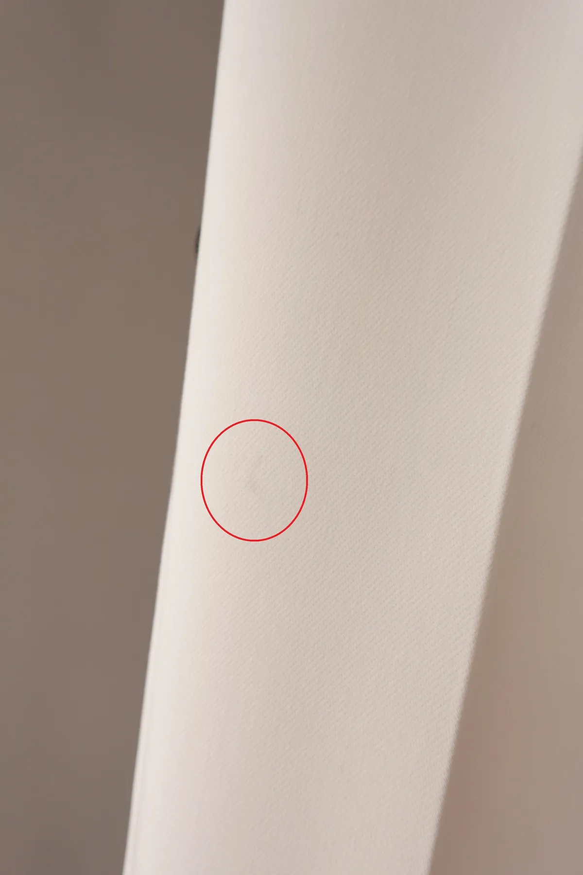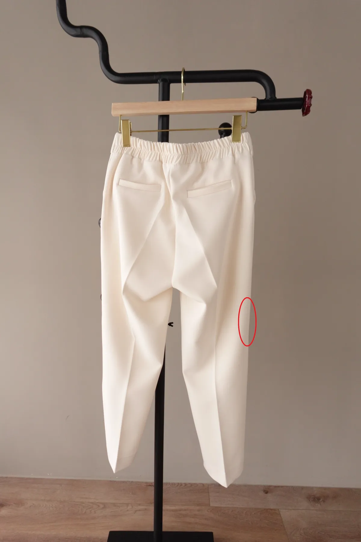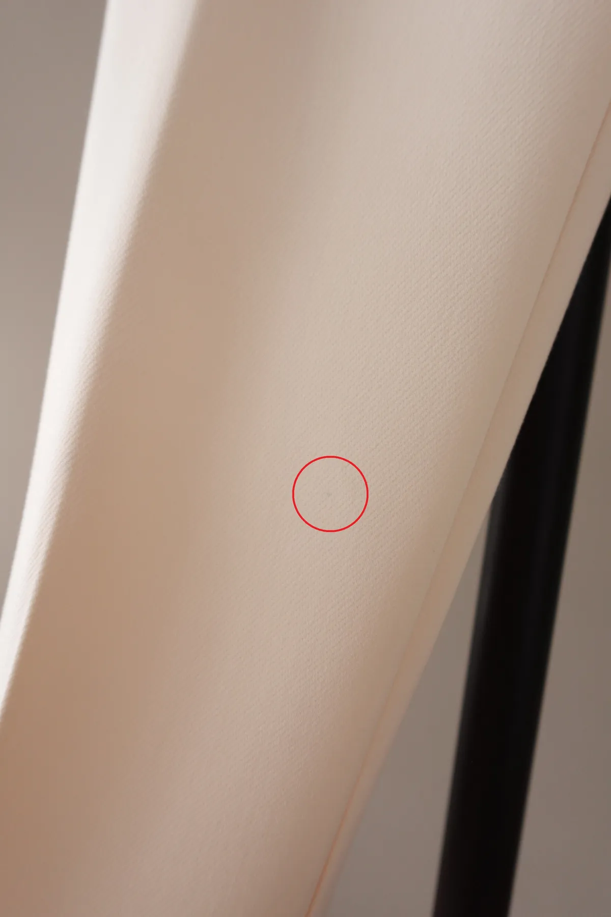 (濃白L瑕疵部位:正面右腰側有一點約0.1CM黃漬+右小腿正面有一點約0.2CM不明顯藍漬,不影響版型)
