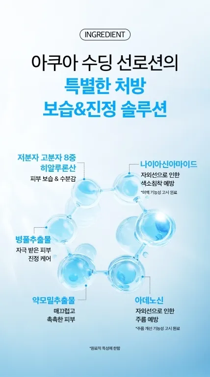 玻尿酸(保濕、鎖水)、蜂膠萃取物(舒緩)、藥蜀葵萃取物(柔膚保濕)、菸鹼醯胺(美白)、腺苷(抗皺)