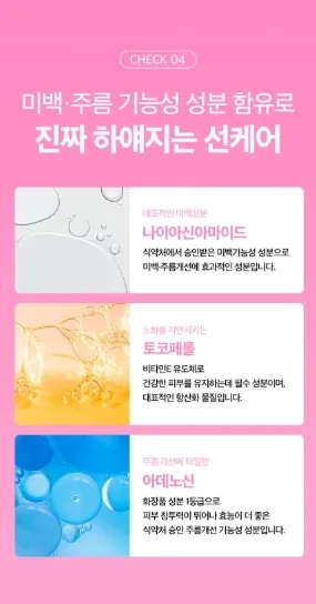 含有菸鹼醯胺(提亮、改善膚色)、維他命E(給予肌膚屏障、維持肌膚彈性)、腺苷(淡紋、提升緊緻度)
