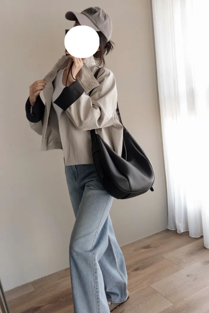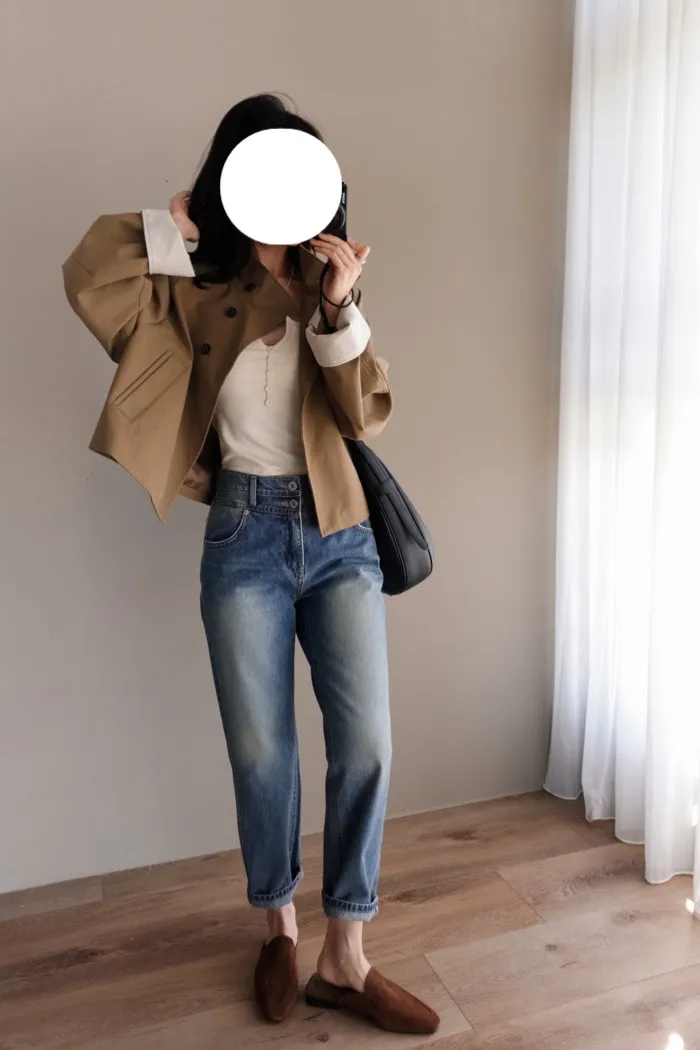 像照片中配上牛仔褲.甚至一件黑褲都很好看