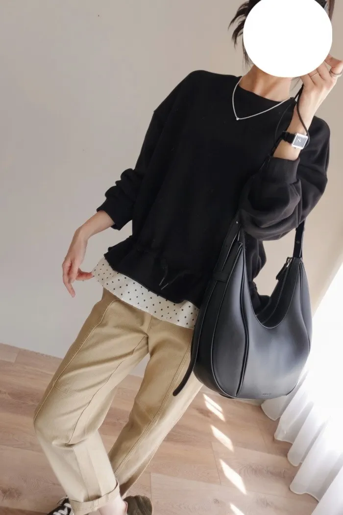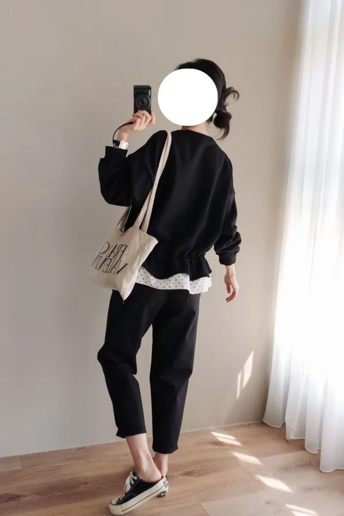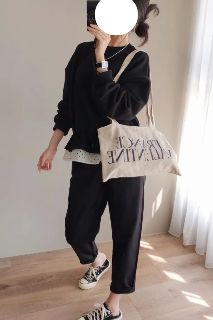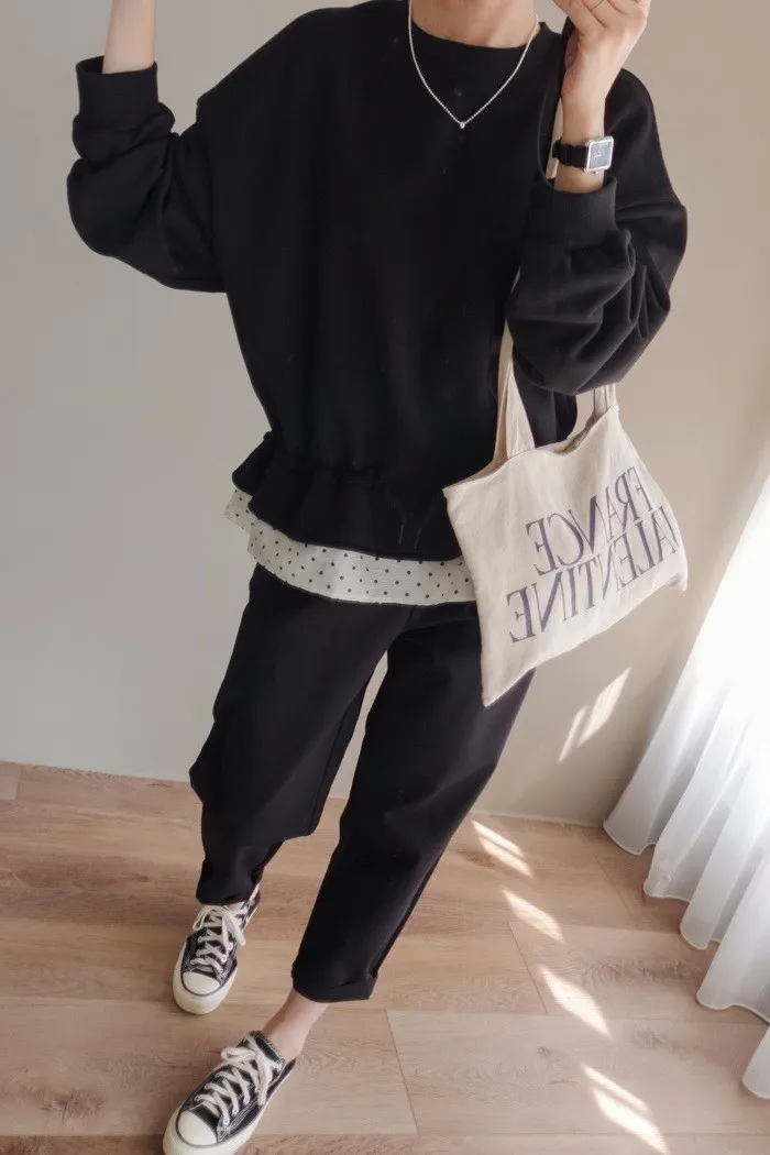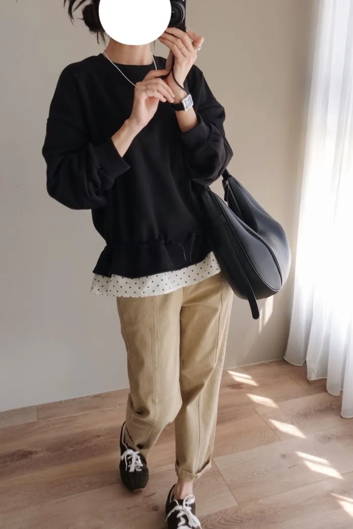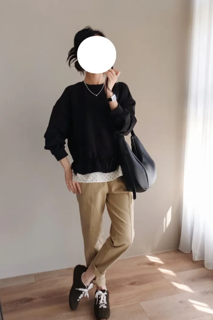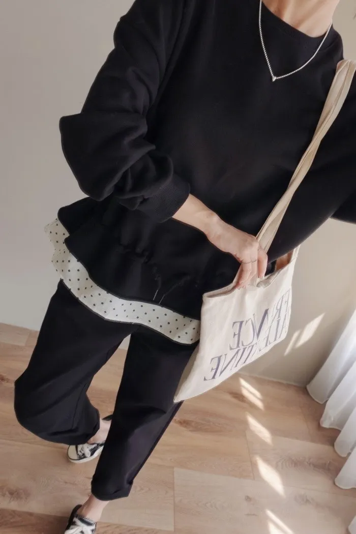 在簡單的黑棉T下方竟然有點點荷葉翹翹衣尾