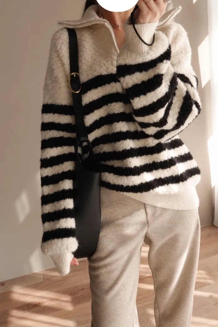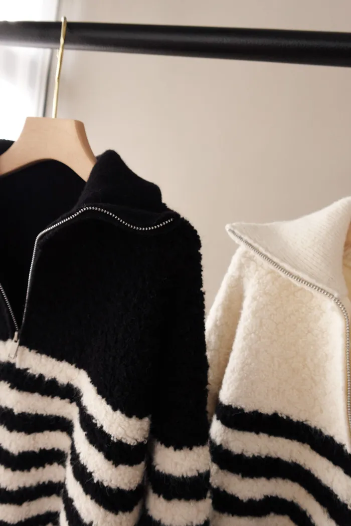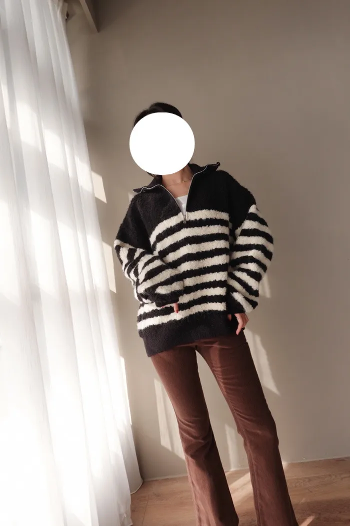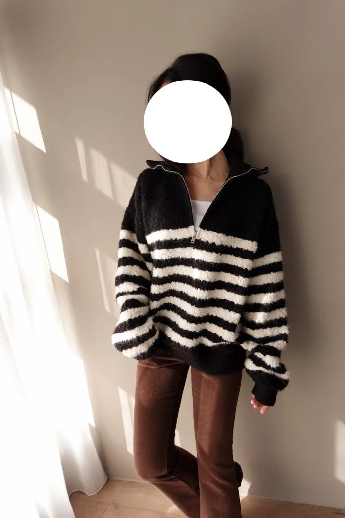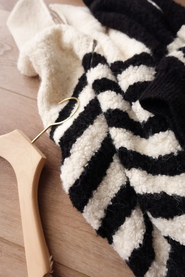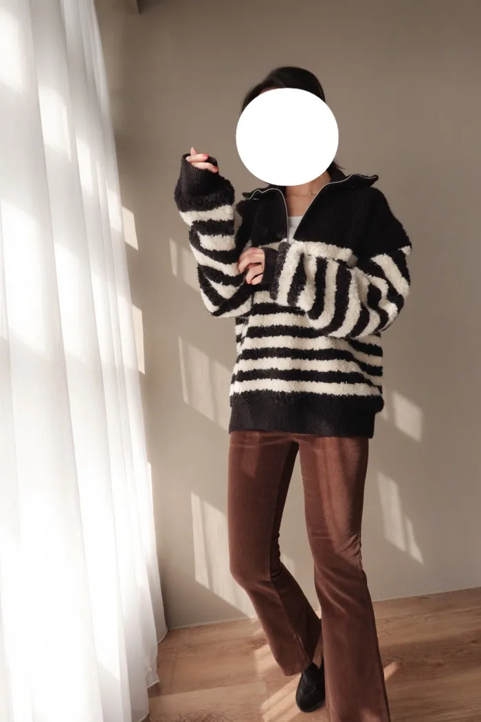 翻領部分是緊密螺紋針織 帶著厚度落在脖子兩側與捲Q毛形成對比
