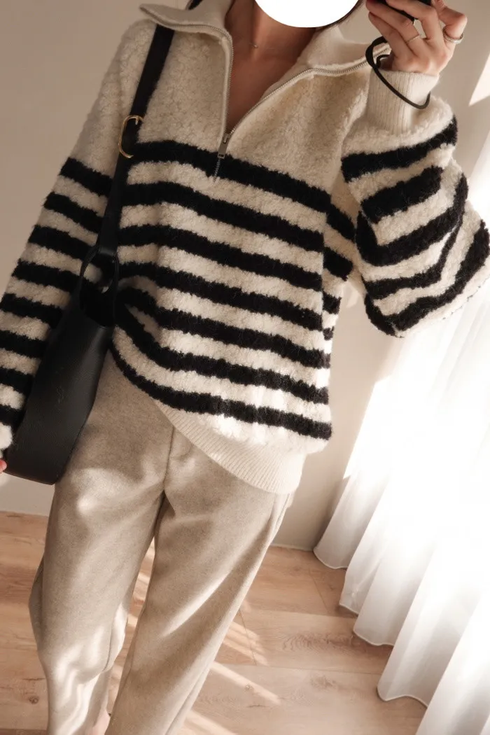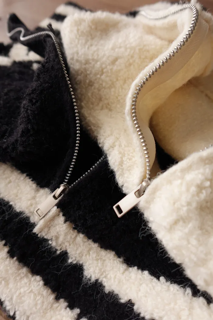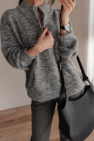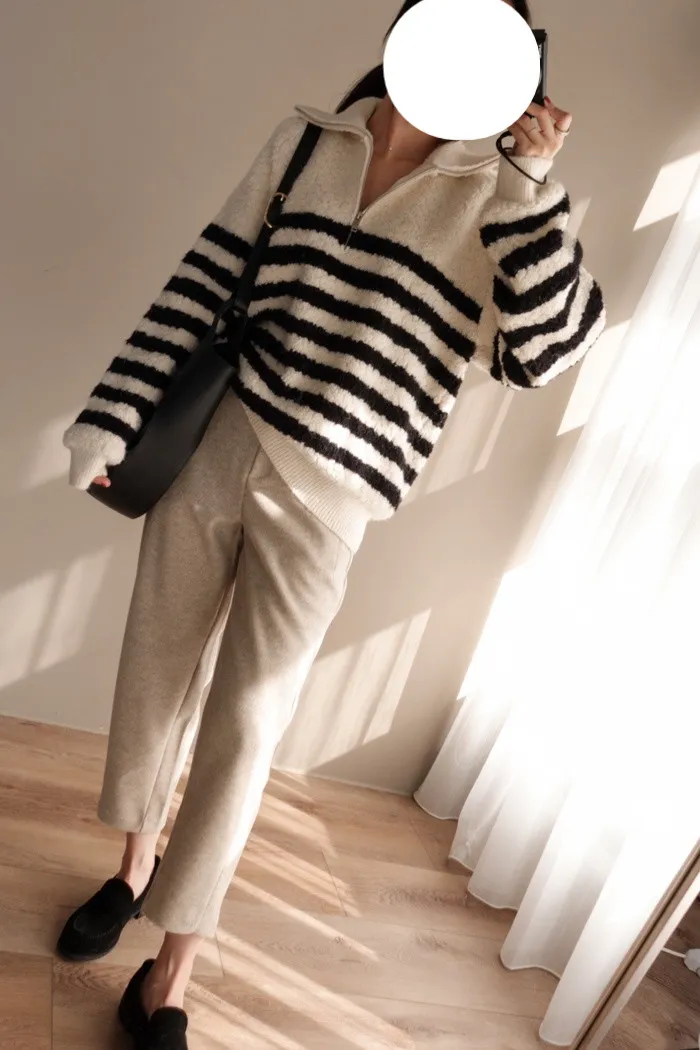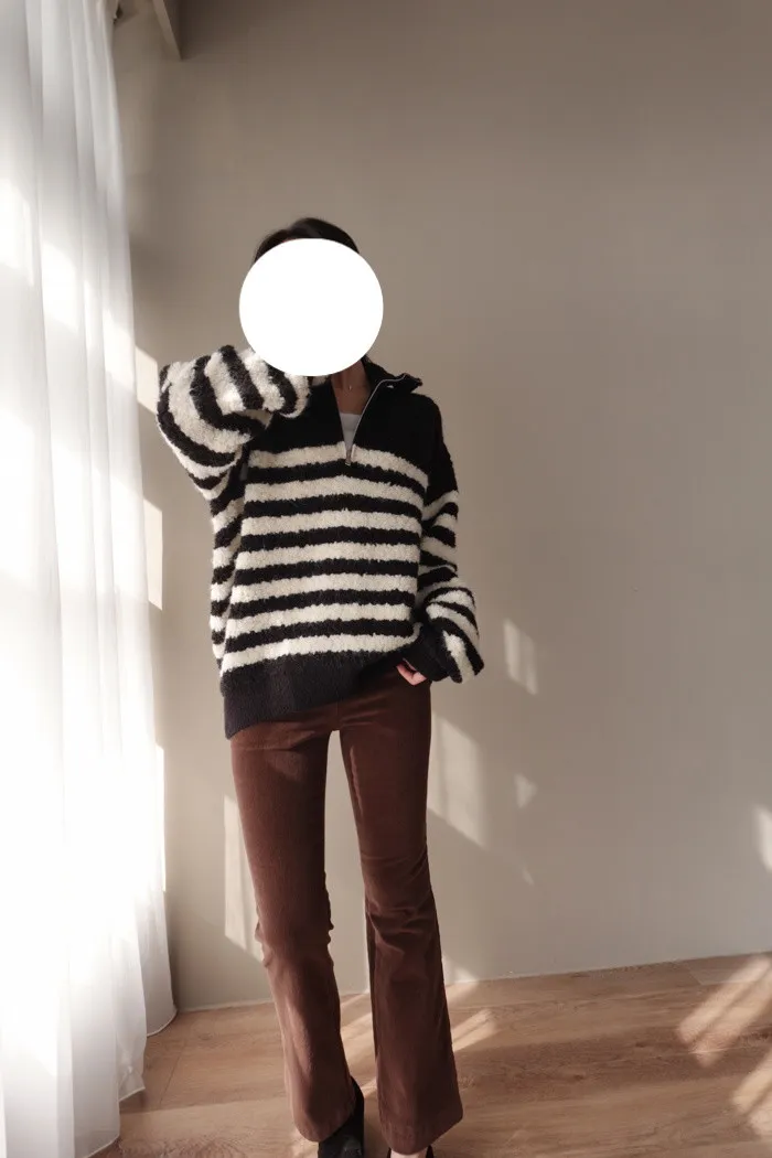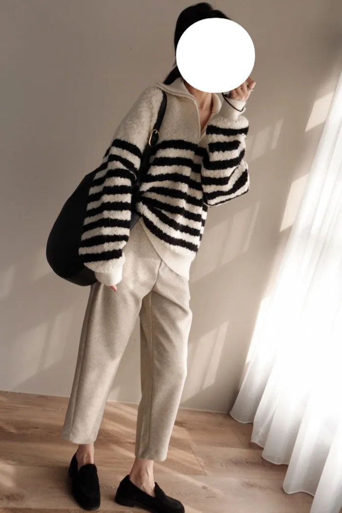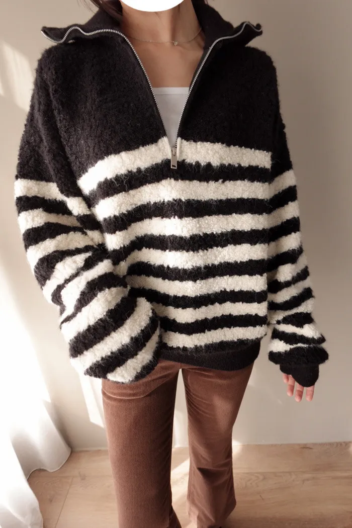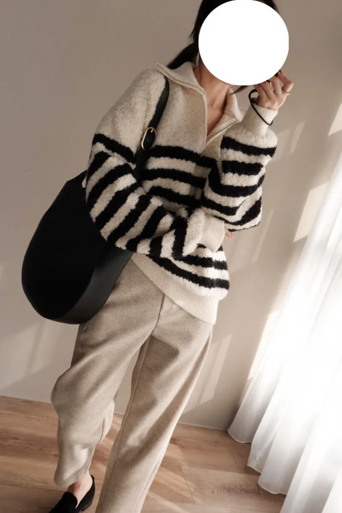 翻領部分是緊密螺紋針織 帶著厚度落在脖子兩側與捲Q毛形成對比