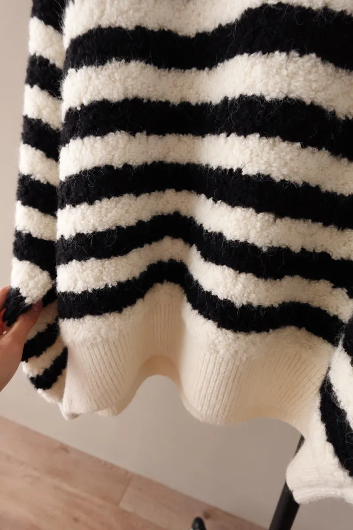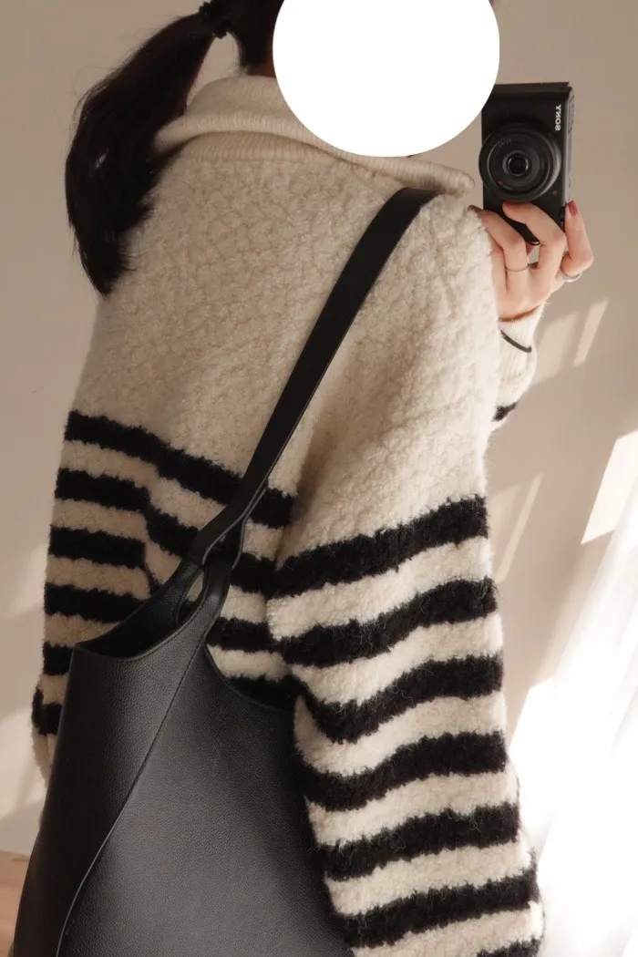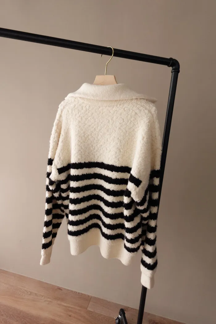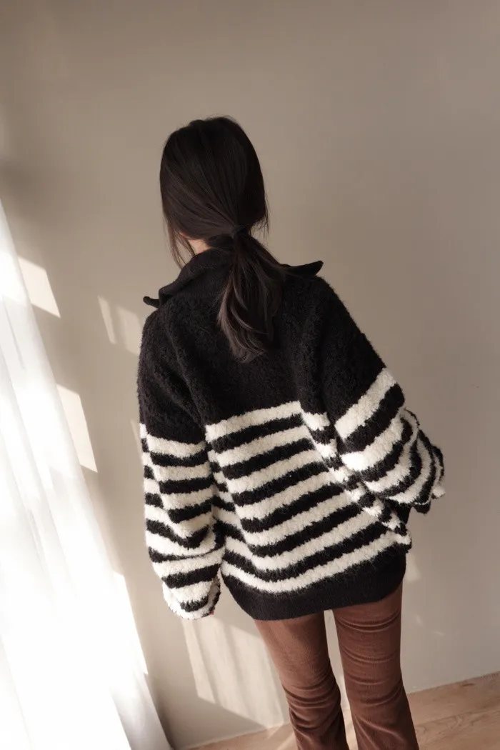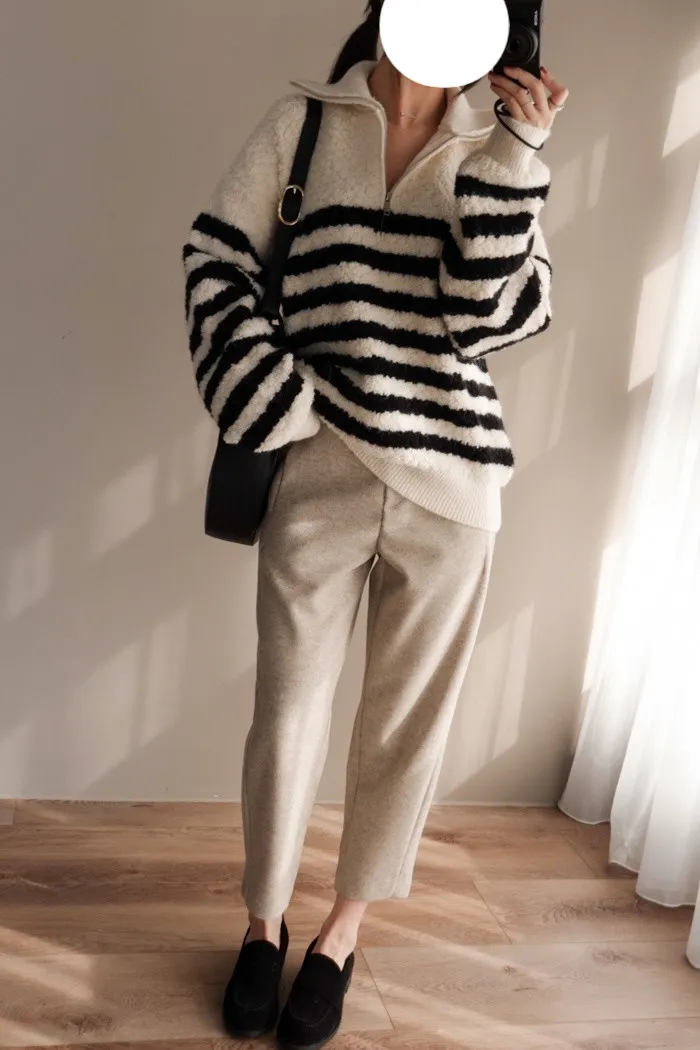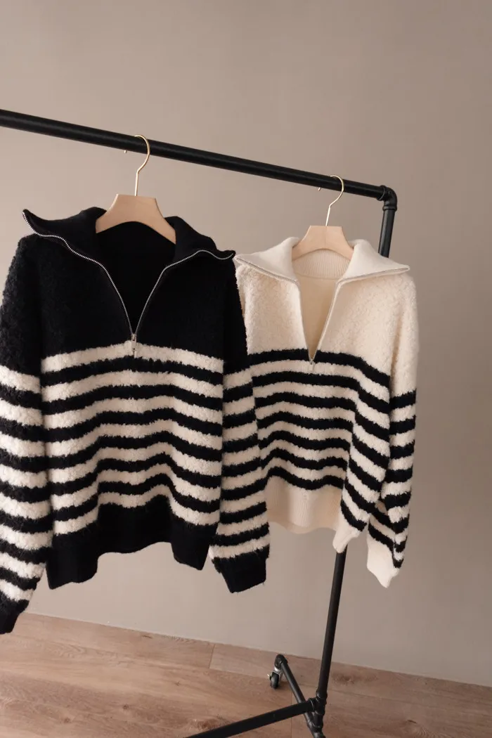 翻領部分是緊密螺紋針織 帶著厚度落在脖子兩側與捲Q毛形成對比