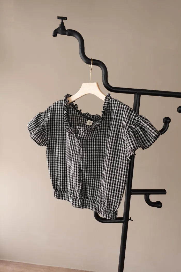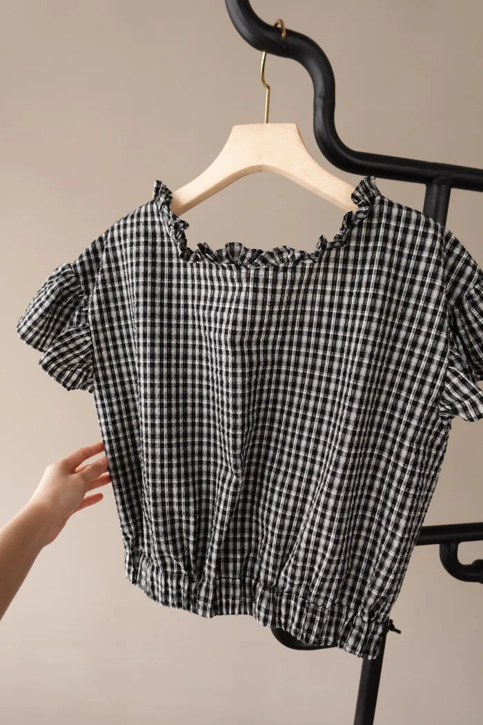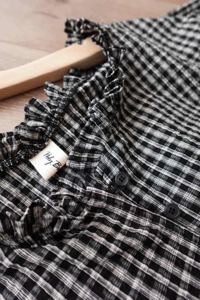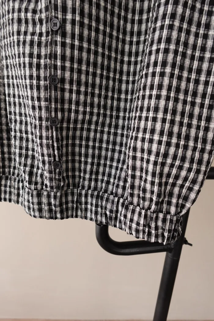 碰上黑灰色小格紋還有面料本身的擰面摺痕