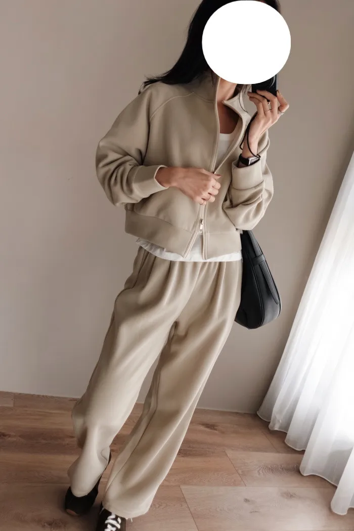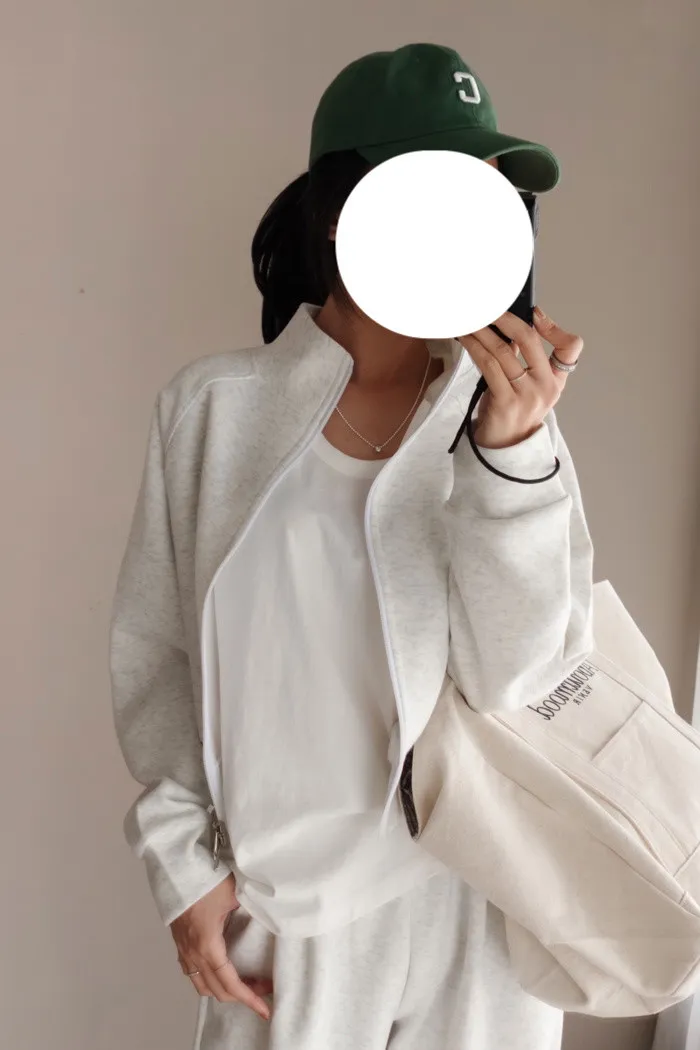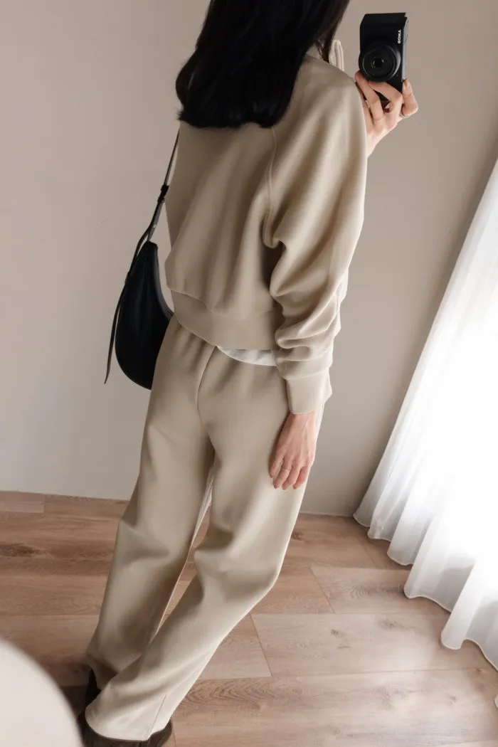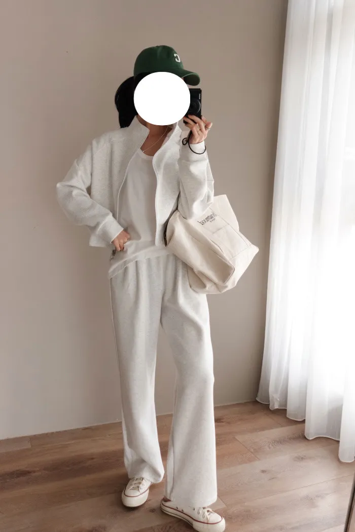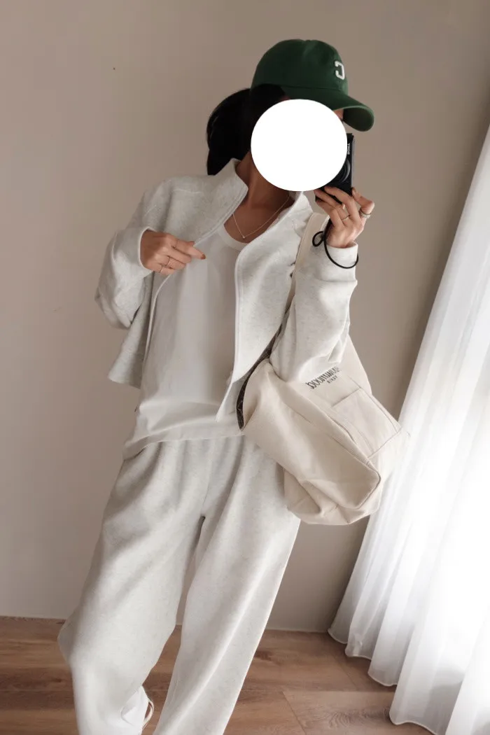 這件的棉質偏奶油霧面 更讓休閒套裝質感升級