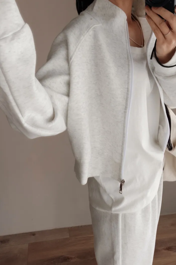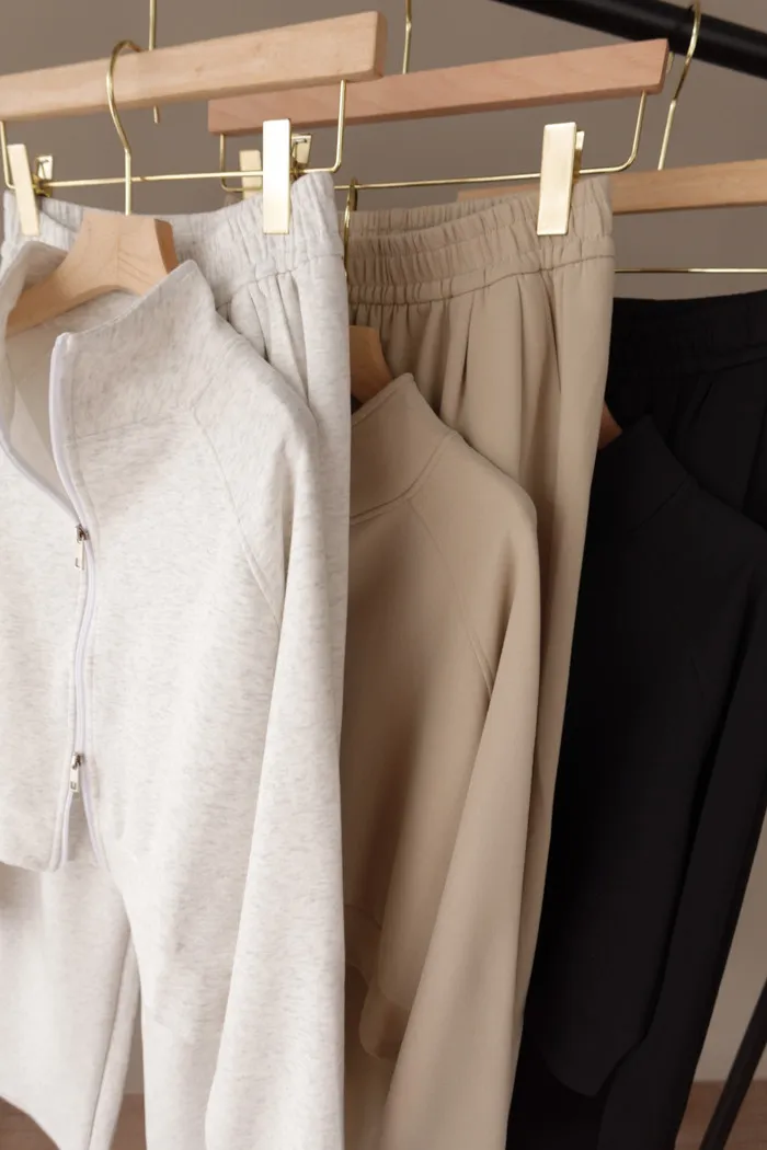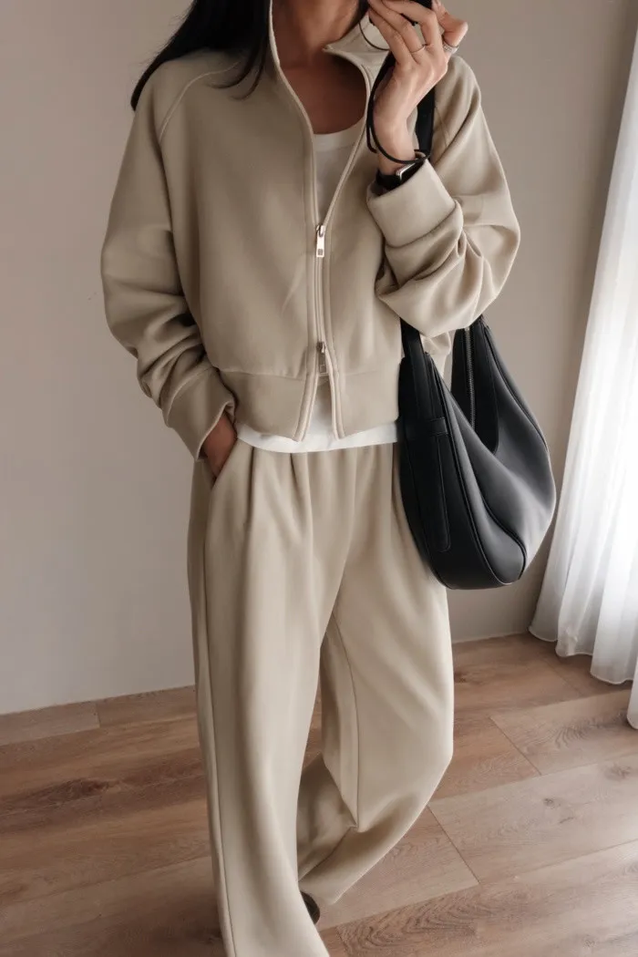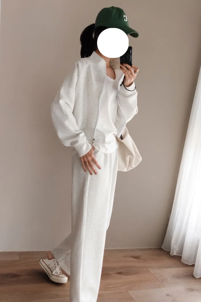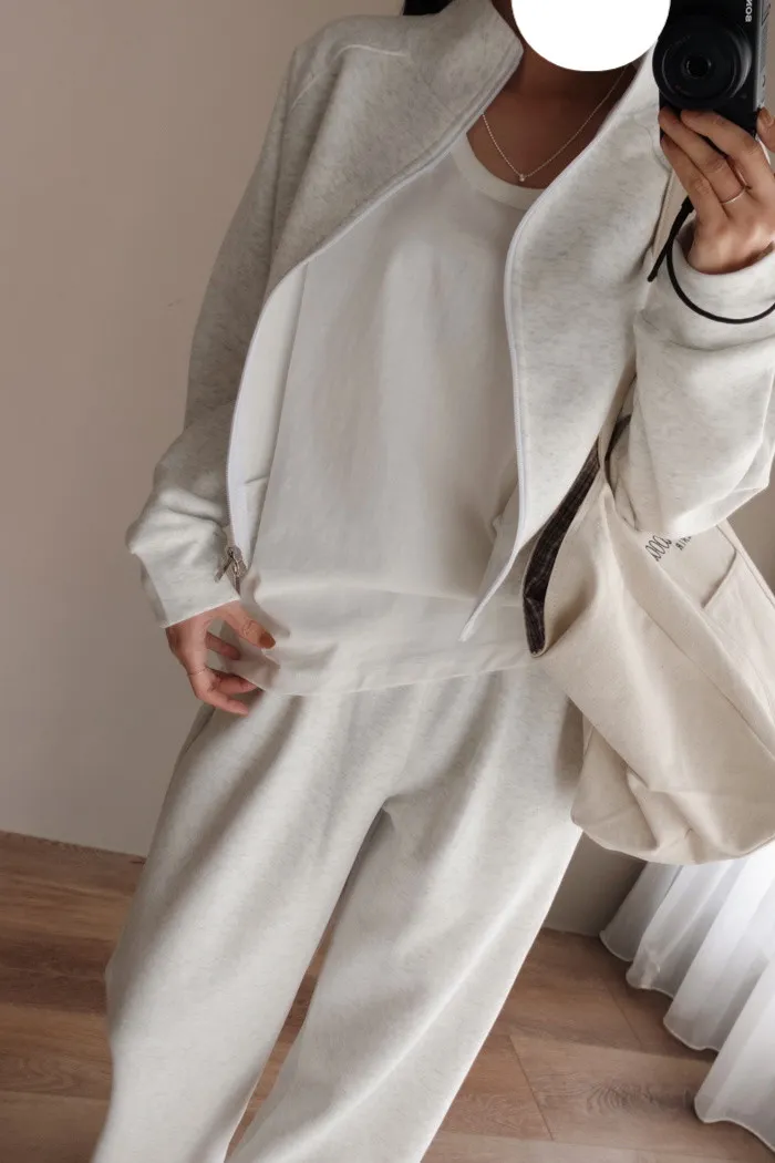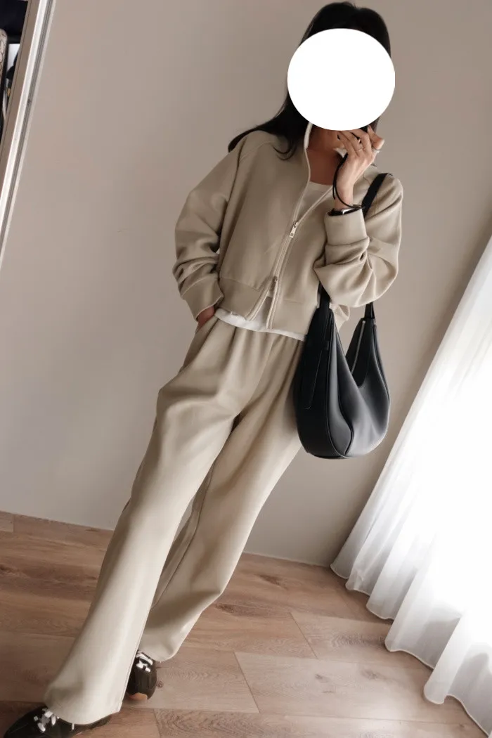 這件的棉質偏奶油霧面 更讓休閒套裝質感升級